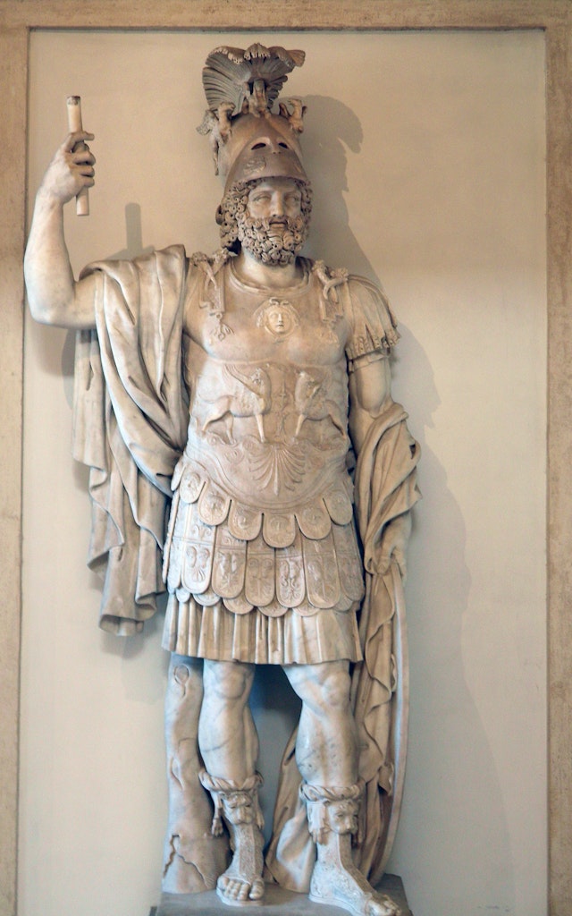 Furious Mars was the Roman god of rage, passion, destruction, and war. As a foundational deity, Mars had a mythology that was intimately intertwined with the Roman city-state. Mars ruled early Rome as a part of the Archaic Triad, a masculine ruling triumvirate that also included Jupiter and Quirinus (the deified Romulus). The early Romans revered Mars as a great raging god, whose fury inspired the savagery of warfare and produced the stunning accomplishments of the Roman arms. As Rome transitioned from city-state to empire and overtly embraced Greek cultural values, Mars lost his preeminent position in the Roman pantheon to Minerva, the goddess of tactical and strategic warfare.Mars’ importance to the Roman people was embedded in the mythic history of Rome and the origins of the Roman state. According to Roman mythology, Mars raped the innocent Rhea Silvia and sired Romulus and Remus, twins who would go on to establish the fabled city.